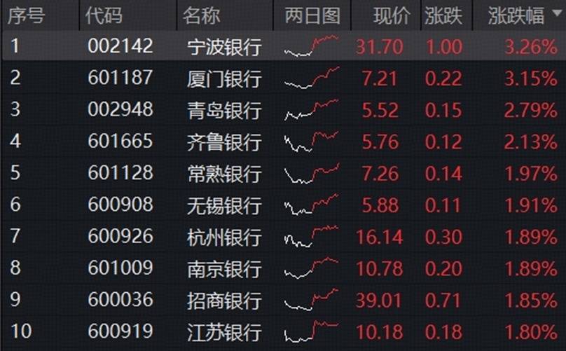 银行低开高走,全天走强,个股集体拉升,截至收盘,A股42只银行股近九成涨逾1%,宁波银行、厦门银行涨超3%,青岛银行、齐鲁银行涨超2%,常熟银行、杭州银行、招商银行等涨幅居前。