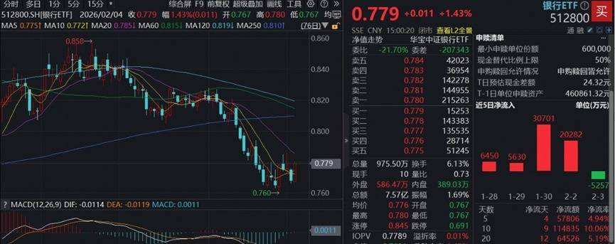 全市场规模最大的银行ETF(512800)场内价格收涨1.43%,收复5日、10日两根重要均线,全天成交额7.57亿元。