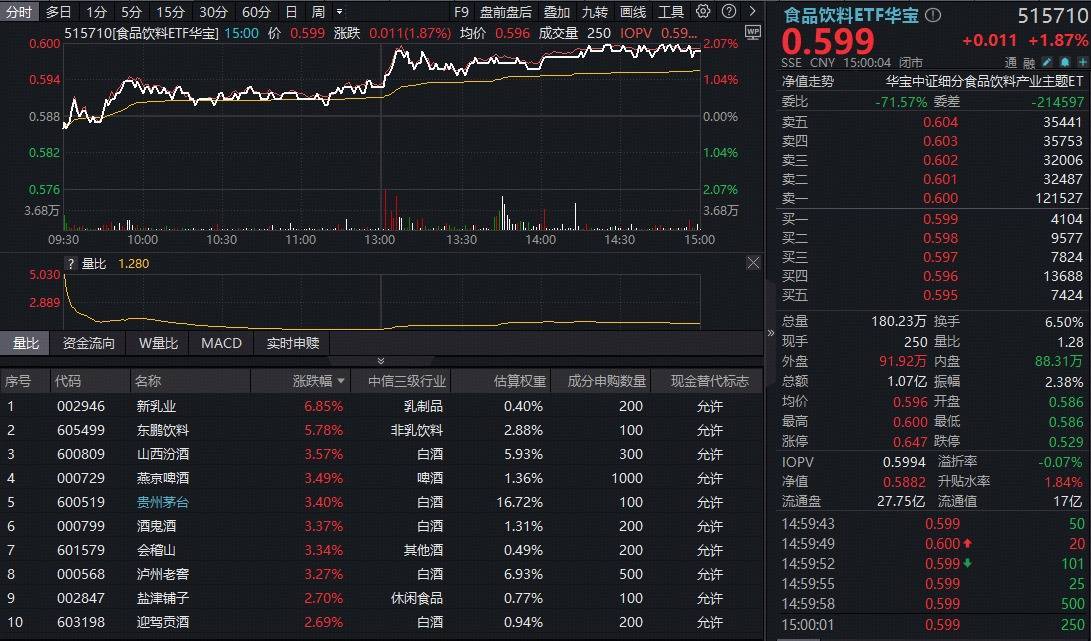 吃喝板块今日继续猛攻!反映吃喝板块整体走势的食品饮料ETF华宝(515710)全天单边上行,盘中场内价格最高涨幅达到2.04%,截至收盘,涨1.87%。
